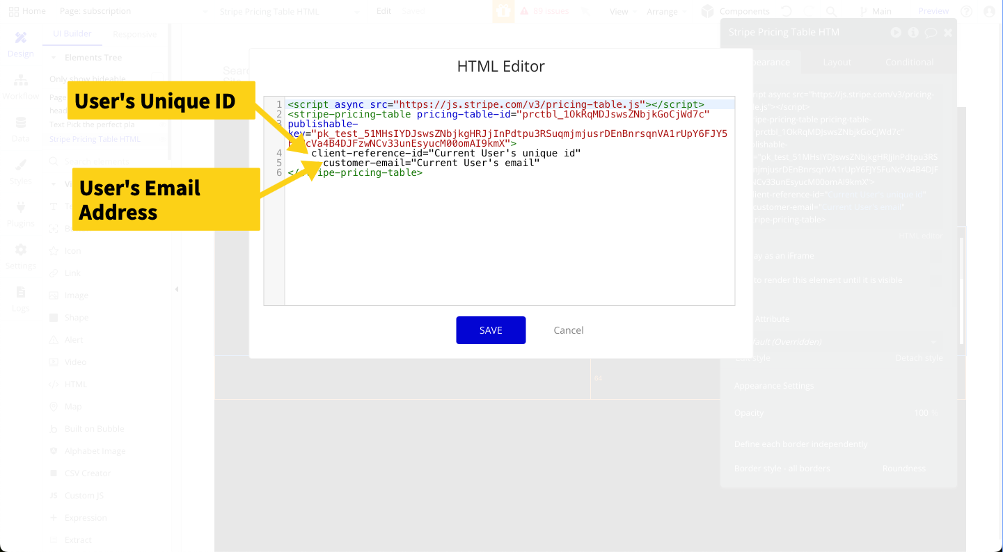 Once you have pasted the code for the pricing table, you need to go back to the HTML element on your Bubble editor and add the following: